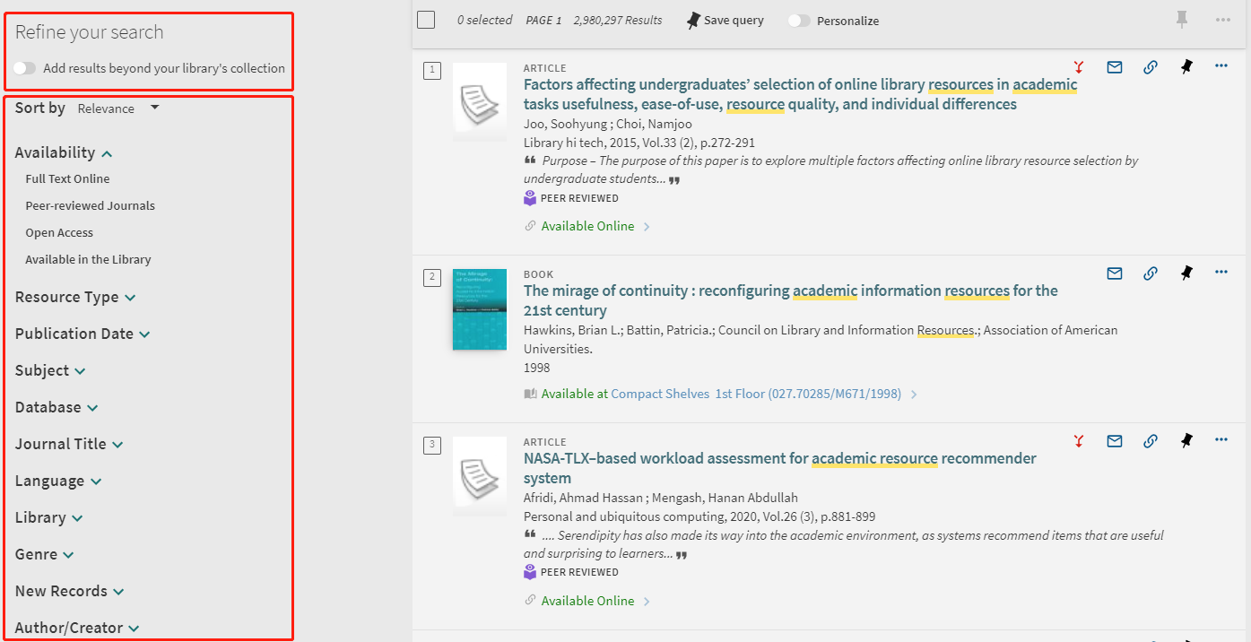 3. Search results are listed by relevance. Use the filters on the left to refine your search by availability, resource type, publication date, subject, etc.