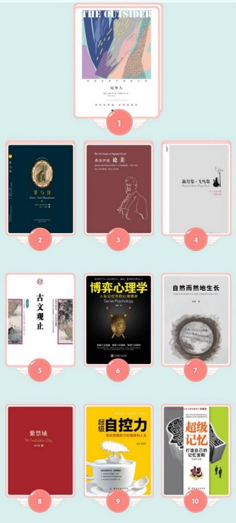 沉默的大多数(372 次),扶桑(322 次),美丽新世界(305 次),呼兰河传(280 次),巴黎圣母院(271 次)