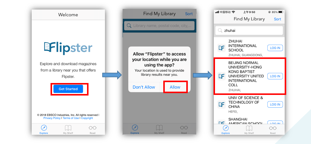 After installing the Flipster app on your mobile device, tap “Get Started”, search for “Zhuhai” in “Find My Library” and select the full name of BNBU.
