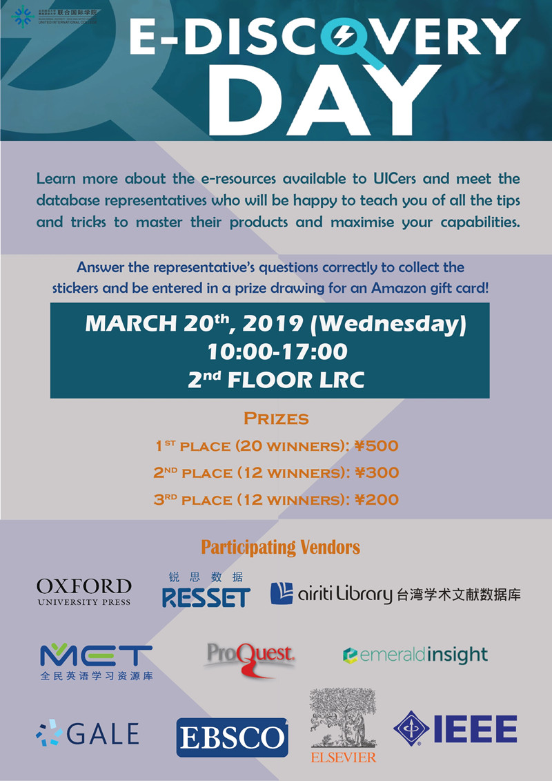 You are cordially invited to the LRC’s E-Resources Discovery Day on March 20, 2019. Representatives from 10 databases will be available to help you better understand the e-resources the LRC subscribes to. You can also enter the Lucky Draw to win an Amazon Gift Card.
