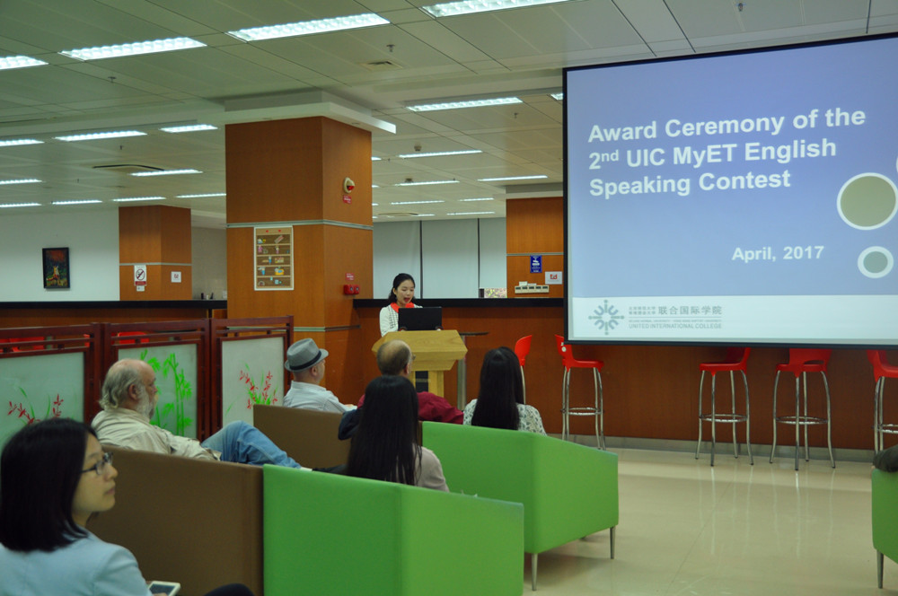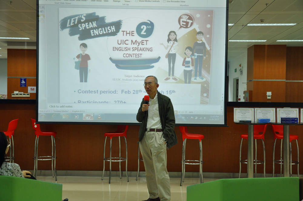 On Wednesday April 26th, LRC held the award presentation ceremony for the 2nd UIC MyET English Speaking Contest, which was a web-based contest jointly organized by the Learning Resource Centre and the English Language Centre. The contest began February 28th till March 15th, 2017. Presenters at the ceremony consisted of Prof. Zee Sze Yong (UIC Vice President), Dr. Viola Wong (Director of the English Language Centre), Ms. Fung Ying Cham (Deputy College Librarian) and Mr. Edward Martin (Lecturer of the English Language Centre).
