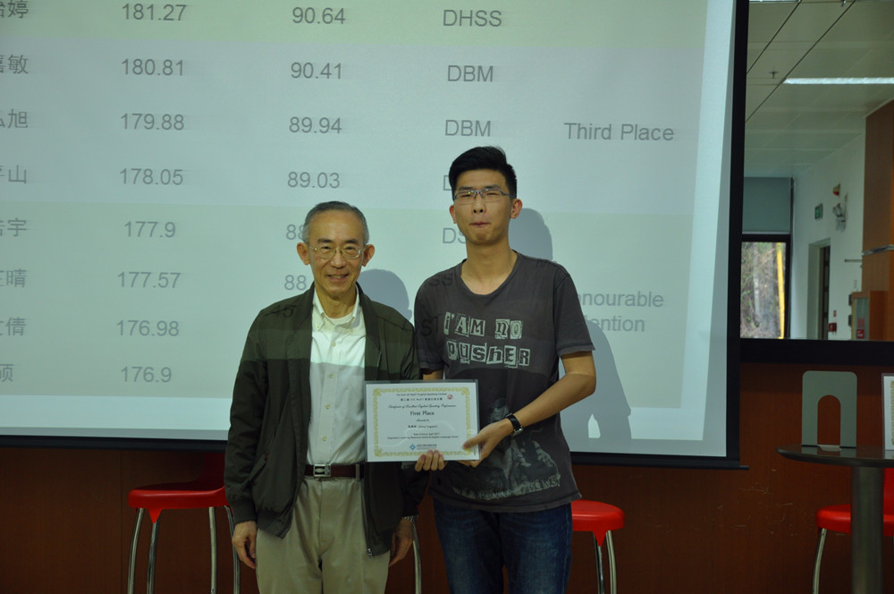 After receiving his award, the 1st prize winner, Year 3 student Zhang Xingquan from DST, shared his experience of participating in the contest. The contest made him aware of MyET, which he found to be very useful as the software can pinpoint his weakness in English speech and help him improve his accent.