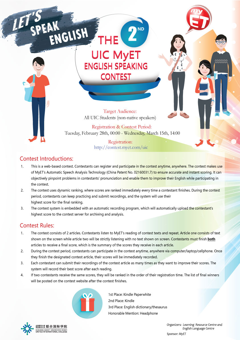 The Learning Resource Centre and the English Language Centre are excited to jointly introduce the 2nd UIC MyET English Speaking Contest which will run from Tuesday, February 28th, 00:00 to Wednesday, March 15th, 14:00.