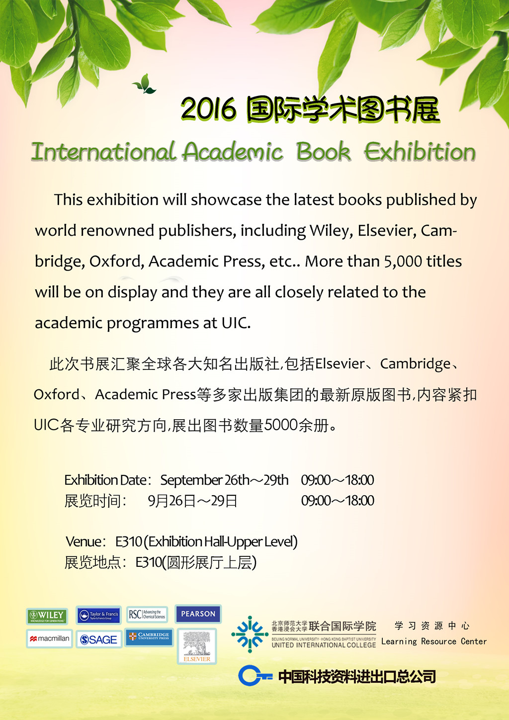 LRC will be hosting the 1st International Academic Books Exhibition for Academic Year 2016-2017 starting Monday, September 26th to Thursday, September 29th, 2016. There will be over 5000 titles published by renowned international academic publishers with subject coverage closely relates to the various academic programs offered at UIC.