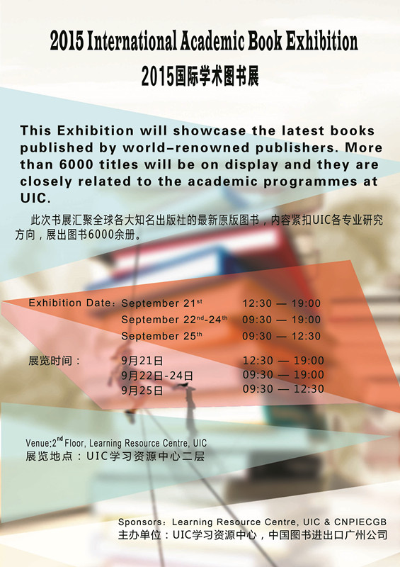 LRC will be hosting the 1st International Academic Books Exhibition for Academic Year 2015-2016 from Monday, September 21st to Friday, September 25th, 2015. Over 6000 titles published by renowned international academic publishers, including those from Hong Kong and Taiwan will be on display at the LRC. Subject coverage closely relates to the various academic programs offered at UIC.