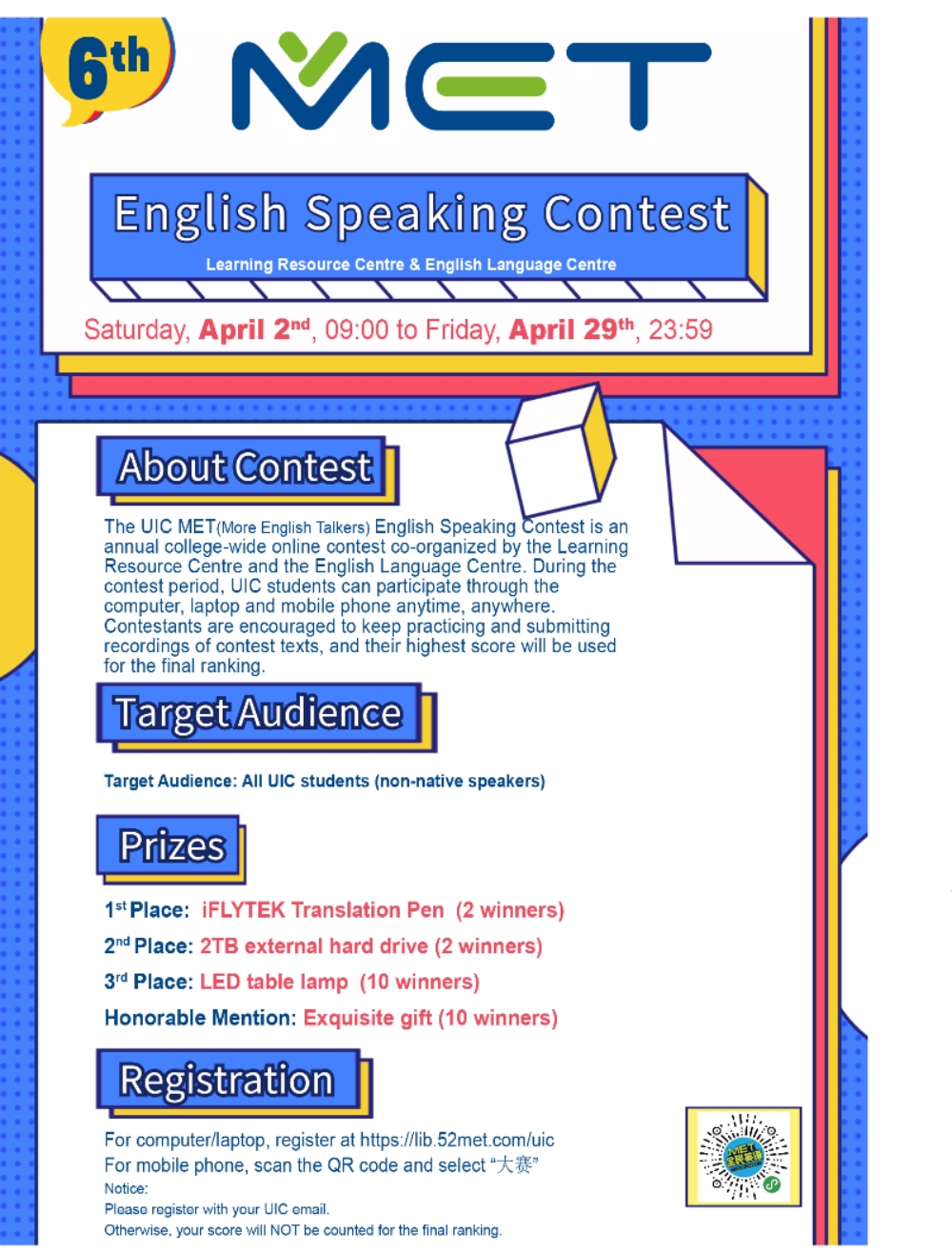 The Learning Resource Centre and the English Language Centre are excited to jointly introduce the 6th UIC MET (More English Talkers) English Speaking Contest which will run from Saturday, April 2nd, 09:00 to Friday, April 29th, 23:59.