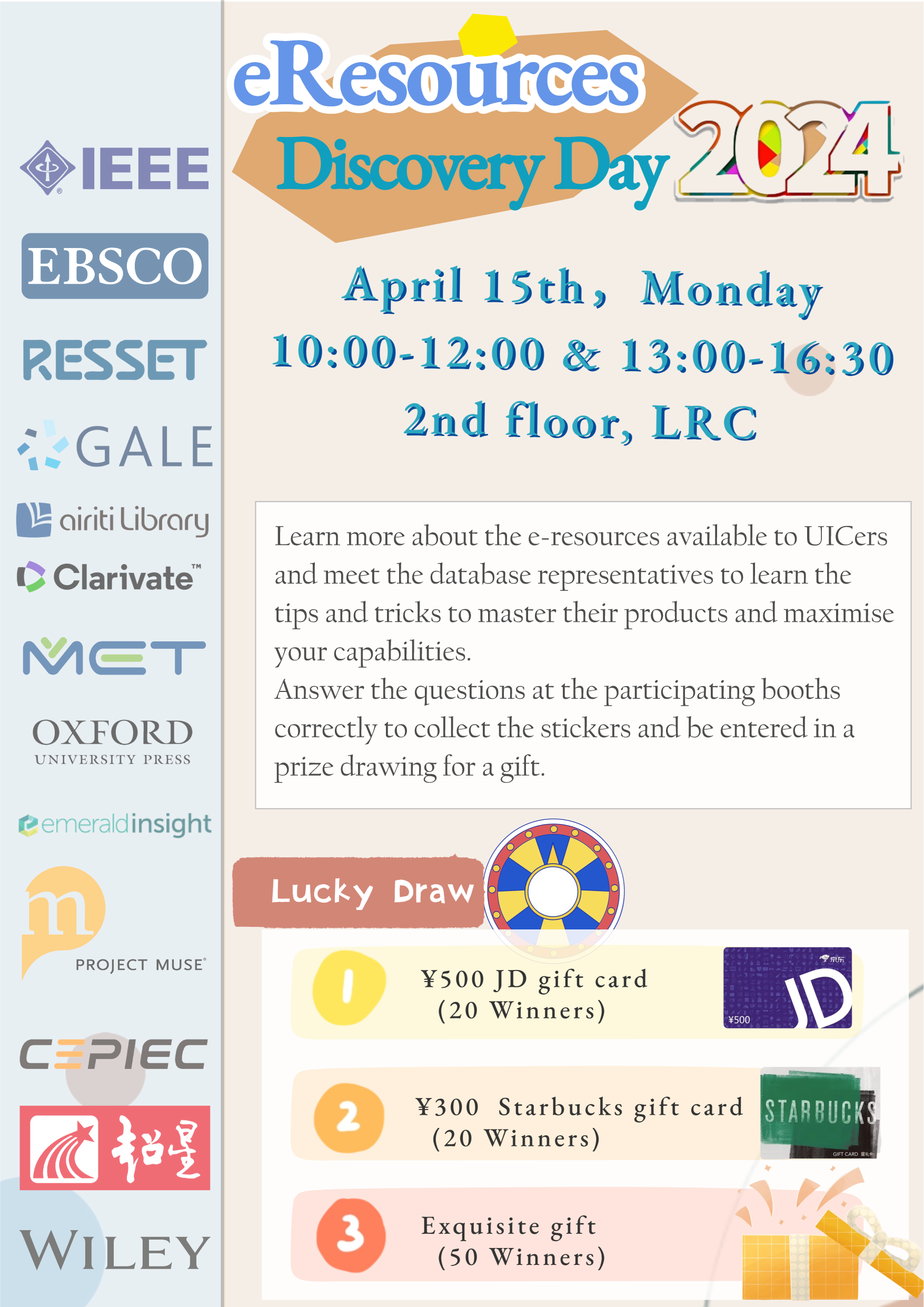 You are cordially invited to the LRC’s E-Resources Discovery Day on Monday, April 15th 2024. Database representatives will be available to help you better understand their resources currently available at the LRC. You may participate in a lucky draw by answering questions at the participating booths.